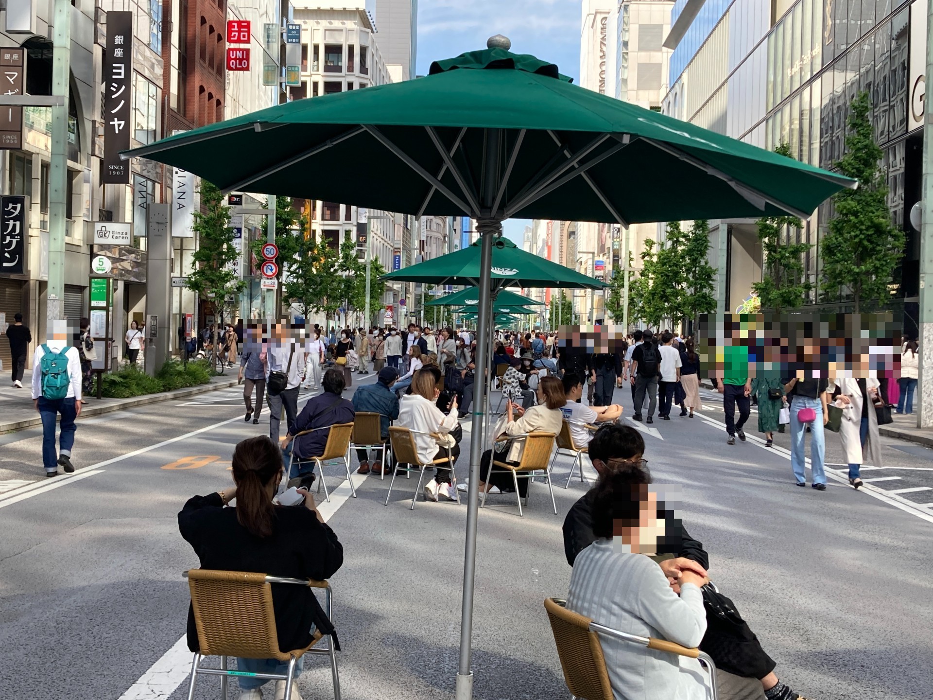 I featured another scene of Tokyo in “Golden Week 2023”, that is , one scene of Ginza street. One apparent difference from the scenes one to three years ago is the parasols set along the center line of GInza street. Last year we already saw quite a lot of shoppers in Ginza, but they did not set the parasols at that time.
