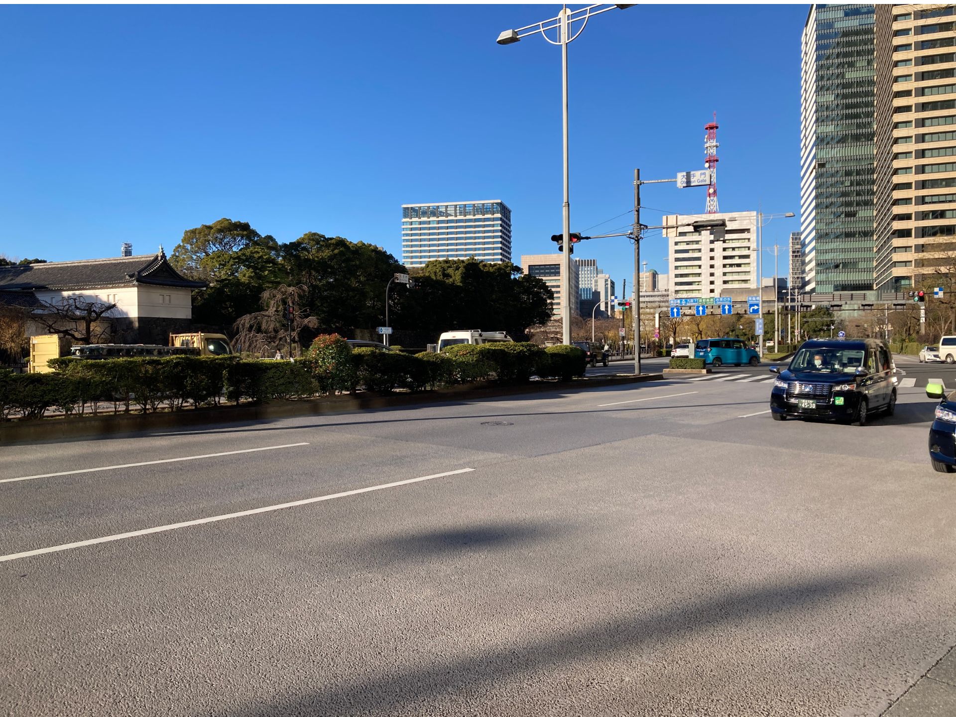 This is Uchibori-Dori. This street is the most inner loop of Tokyo: some people call this street “Loop 1”. The reason is apparent. This street runs along the inner moat of the imperial palace,that is , used to be the inner moat of Edo castle. Inside this loop is the residence of the royal family. Many people enjoy 6km-jogging along this street.